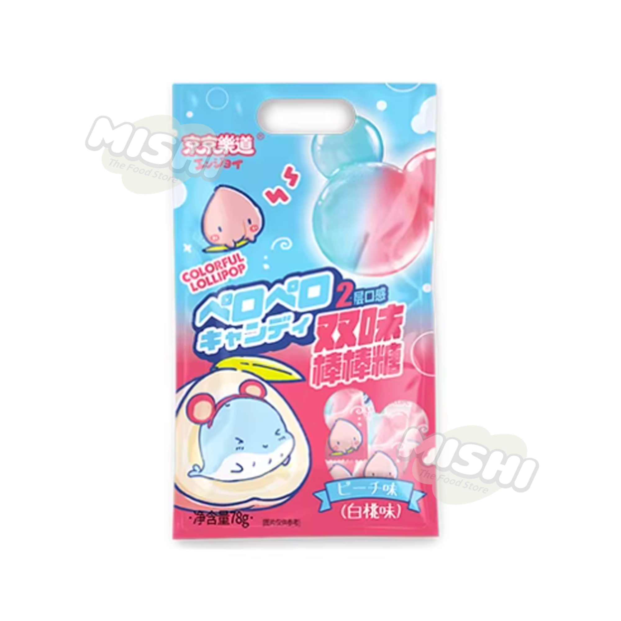 White Peach Flavored Dual-Flavor Lollipop: Combines two flavors with a cute design, ideal for children’s snacks.