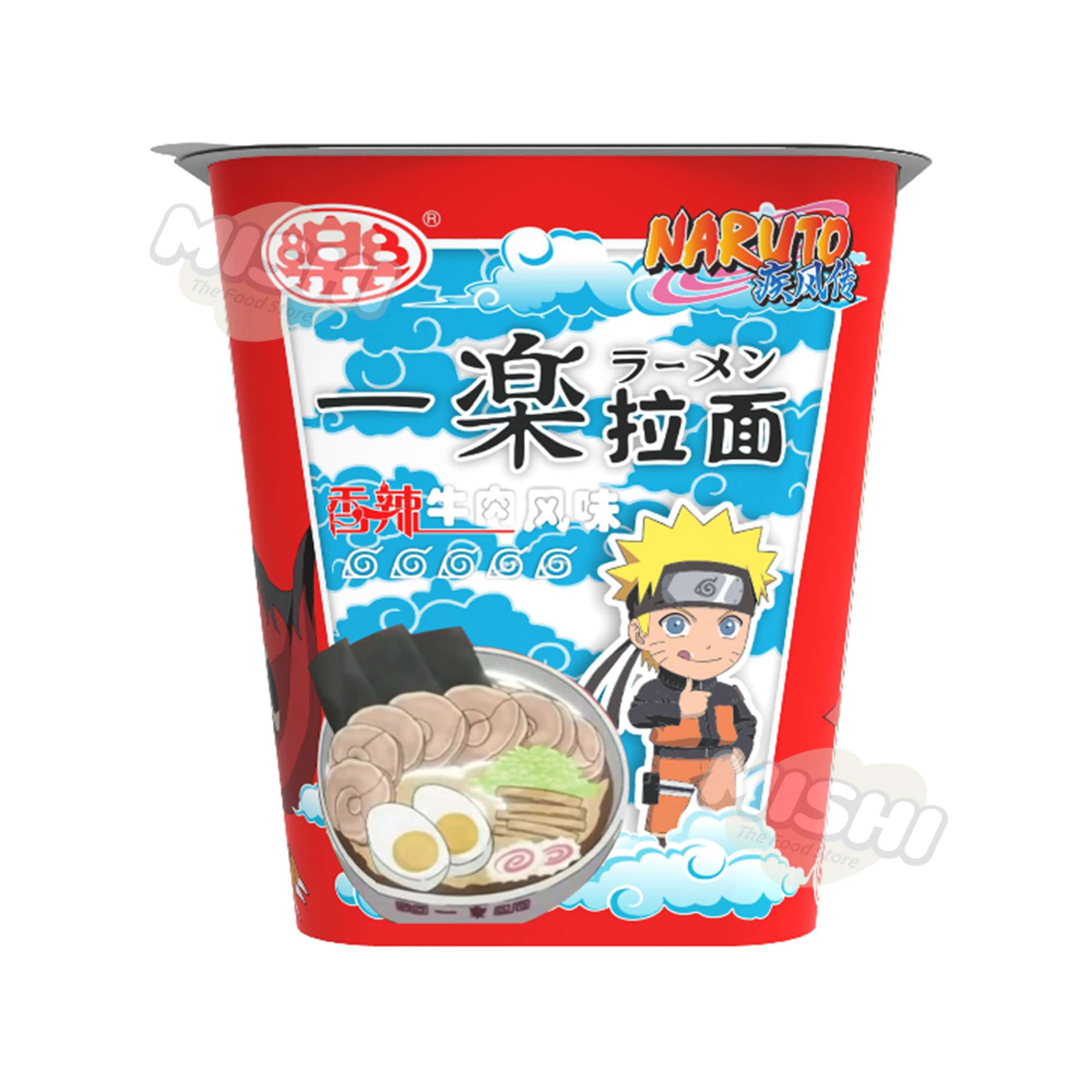 Cup ramen, spicy beef flavor, chewy noodles, rich broth.